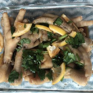 在鸡爪中加入3/4的柠檬汁,1/4的柠檬片,切成末的香菜,1勺醋,3勺酱油。