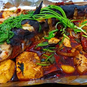 将豆花倒入烤盘中,放入烤箱再烤10分钟。出烤箱前两分钟放入薄荷、香菜等。到时出炉。香喷喷的烤鱼就完成了。