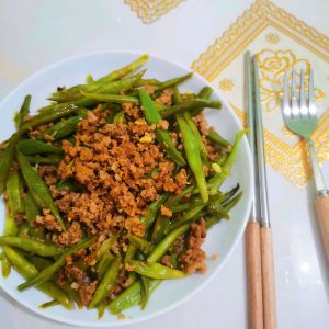 油热了+蒜蓉+蚝油+鸡精+四季豆(我一般习惯调味好了,才放豆的,不然怕不均匀),最后加肉沫。