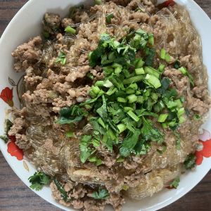锅内热油,葱蒜下锅,爆炒,倒入少量酱油,把猪肉末放进去炒至变色,倒入适量水,把粉丝加进去,水要莫过粉丝,盖上锅盖,煮至水几乎没有了即可