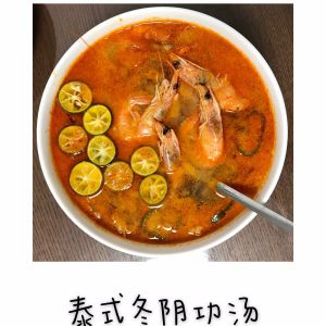 加汤,加香茅、南姜,冬阴功酱煮开,虾和香菇下锅