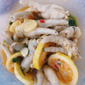 将香菜洗干净(留着叶)切成一厘米的段,蒜,2/3切片,1/3切沫沫,小米辣切片,柠檬切片去核,把这些切好的料放入一个大盆中,分别加入生抽,蚝油,鱼露,柠檬汁,冬阴功酱,白醋,剁椒酱,盐和白糖拌匀。(可以调的偏口重一点,加入鸡爪会吸味道)