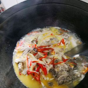 准备老姜,花椒粒,料酒两勺,盐30克放入铁锅中,放入清水烧开。