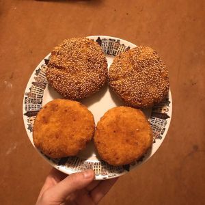 铺上油纸撒点糯米粉防粘,注意不要撒多了,不然会不好裹芝麻或者面包糠,挨个放上红豆馅,我的红豆馅是自己做的稍微有点干