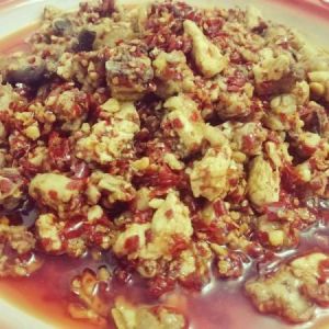 锅中放油,将糍粑辣椒炒熟,放入鸡肉,放盐,白糖,鸡精,味精,酱油,耗油,花椒面,十三香继续炒6到10分钟,起锅装盘。