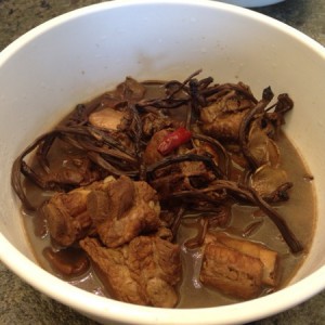 添入水和泡好的干菌,转小火慢炖不少于半小时。