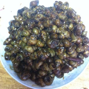 放入田螺翻炒,把田螺全部炒均匀然后放入半小碗水,放入盐,味精,鸡精,香油,翻炒均匀,盖上锅盖改小火收汤至三分之一。