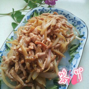 我选用的通脊肉,洗净后切细丝,加入少许生抽,鸡精,以及少许食用油腌制10分钟左右吧