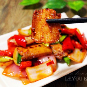 放入洋葱、红辣椒煸炒,然后加少许盐、酱油,接着倒入青蒜苗略微煸炒匀均,出锅前放入少许鸡精。最后关火,淋少许香油即可。