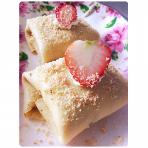饼皮里加入奶油 因为正好有剩下的提拉米苏奶酪,就直接用上了 ,再加水果,包好即可