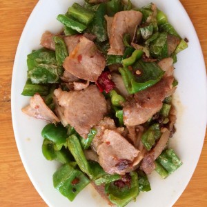 放入五花肉一起炒,然后放入青椒,起锅放入盐鸡精!