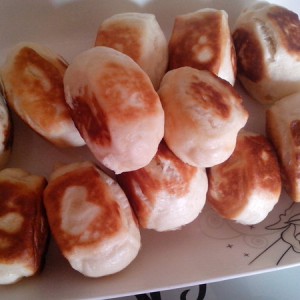 蒸锅蒸格上刷点清油免得粘面。水烧开后放入煎好的馒头。可惜我想一锅蒸完,所以有点挤,若松点馒头可能膨胀得更大。大火20分钟后出锅。热气腾腾的,一个个紧挨着,好可爱。