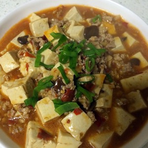 豆腐切成小块,蒜和姜切碎,肉糜用料酒腌制一下去肉腥。切点葱叶等会出锅做点缀。