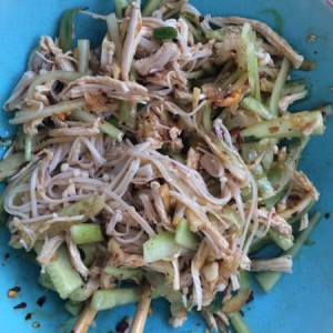 鸡肉煮熟够放凉,或用冰水冰镇后掰成丝