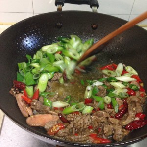 加入腰花,大葱段,大火爆炒两分钟,视味道适当加盐,断生后立即乘出,装盘即可