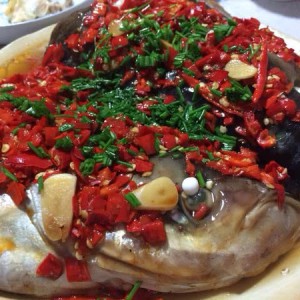 鱼头事先用料酒 盐 糖 姜片腌15分钟 盘中摆好 将炒好的剁椒均匀的铺在鱼头上 冷水上锅蒸三至五分钟后将汤倒掉(有腥味) 继续蒸 水开后中火蒸20分钟 关火闷五分钟出锅 淋蒸鱼豉油 洒小葱 热油淋