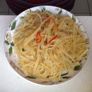 继续翻炒两三分钟至土豆丝熟,加酱油上色,加盐和糖(按个人喜好),出锅。