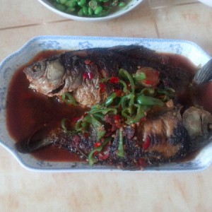 如果你是两条鱼也是这样煎,好了以后,鱼放碗里,把多余的油用碗打出来,还可以炒菜,锅里剩下一点,开大火,放入姜,加水,一碗左右,放入豆瓣酱,干辣椒,一点点的酱油,切好的青辣椒,滚开以后,尝咸淡,,调味后,放入鱼,沸腾一会,把鱼装起来,撒一点孜然粉,再把汤汁淋上,ok