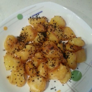 糖液微黄时关火倒入炸好的地瓜翻几个下出锅,撒上熟黑芝麻。开动,趁热才香甜可口