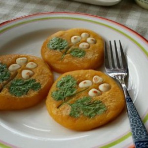 取香菜叶剪好需要的造型,杏仁片150度烤5分钟左右,颜色从白色变淡黄。把南瓜面团分成8个,分别按压成圆饼状。装饰上香菜叶、杏仁片成为花朵的造型,杏仁片中间还可放几粒黑芝麻做花蕊。