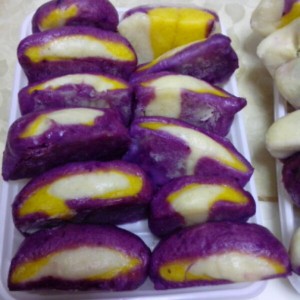 面粉用米酒发酵好后,分别加入牛奶、蒸好的南瓜、蒸熟紫薯,擀成三张面皮,按自己喜欢的颜色卷起,刀切,上笼蒸好即可