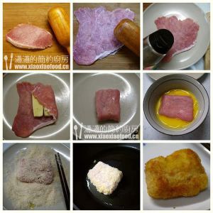 将马苏里拉奶酪包在猪排中,四面裹起。