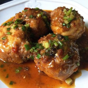 锅内下油,入蒸熟的酿豆腐果轻轻煎一下,鲍鱼汁、辣椒酱、盐和糖加两百毫升水搅拌倒入锅中,撒入小葱,收汁即可