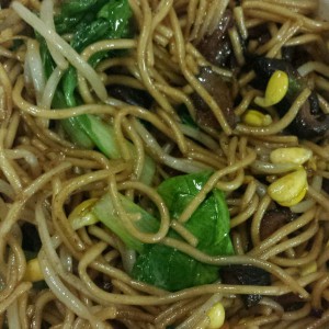所有菜准备好 油热后放肉 (个人喜欢肉微微焦点) 放入香菇 多炒会 放小葱 放豆芽青菜 炒十几秒放入面条 中火炒 放酱油 鸡精 盐 味精 炒两分钟 大火炒炒 收火 美味哦