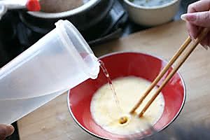 加水,注意,不要加冷水,这样蛋液会不容易凝固,也不能加开水,这样就冲成蛋花汤了,只能加40度以下的温水,而且要一边加一边搅直至盐完全溶化。同时注意所加的水的份量,水和蛋液的比例要适当,以1:1的比例为佳。