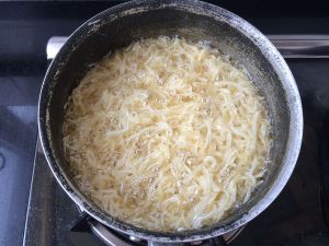 油热至7成时,放入已经沥去水分的土豆丝,刚放进去会有很多的小泡泡