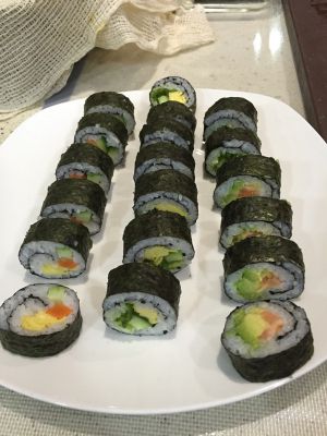刀工好的切小块,刀功不好的,中间一刀切一下就能吃了。我最爱的是牛油果三文鱼,味好美。