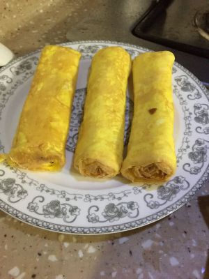 煎蛋卷:4颗鸡蛋打散加入白糖,煎一层卷起来放锅子的一端再同口锅里继续加蛋液,这时把蛋液滚满锅子还要粘连上之前卷过的那个卷,半干状态下把之前的蛋卷朝新摊好的蛋饼方向卷起,然后再重复一次上面步骤,一个蛋卷就做好了,我做了3个,没用完。蛋卷一般跟调味海藻、黄瓜、腌制白萝卜一起卷。