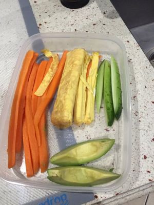 胡萝卜要用白醋和白糖煮的沸水过一遍,这是一个给胡萝卜条紧急入味软化口感的方法。黄瓜切条,牛油果一分6瓣,一条寿司放2瓣,蛋卷切条