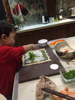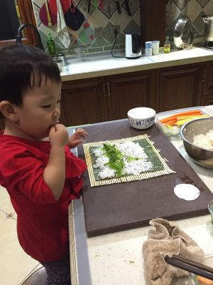最后一步就是卷了,大米调好味道晾凉,平铺,不要放太多,平铺开就好。在图中位置放上各种馅料,最顶端的空白处抹水最后可以把寿司封口。