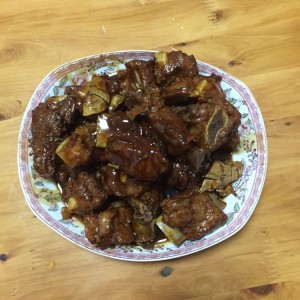 排骨煸炒至变色加入生抽和老抽煸炒上色加入清水开大火烧开加入老冰糖、盐、和葱大火烧开转中小火炖20分钟