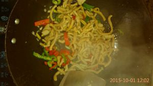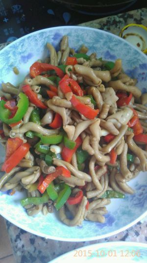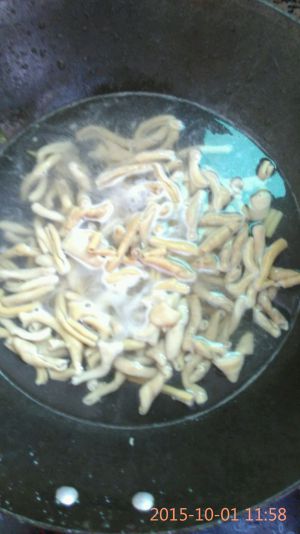 然后把鸭肠倒下去炒,放点生抽,耗油,盐,大火翻炒,