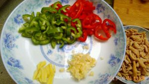 把材料备好,切好辣椒,姜切丝,蒜蓉,料酒,鸭肠用盐洗再把鸭肠切好