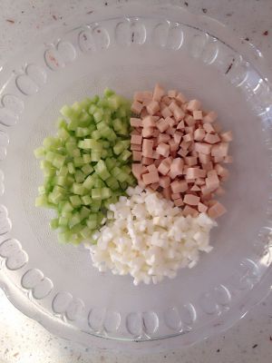将黄瓜火腿蛋白切丁准备 蛋黄捣碎