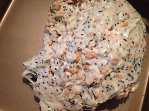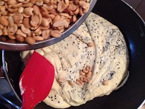 从烤箱中取出花生加入牛轧糖中,并且迅速拌均匀
