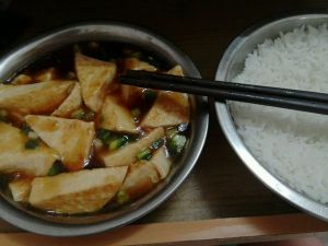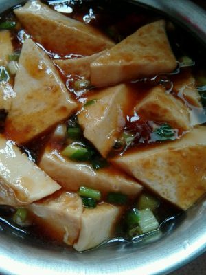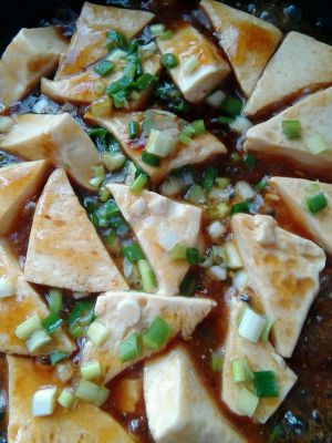 调汁(三到四小勺番薯粉或者生粉,加酱油,再加适量的水,搅拌均匀即可),将调好的汁倒入不粘锅,用勺再慢慢翻炒,把葱花倒进,再翻炒几下,看到汁跟豆腐已经粘稠,即可出锅