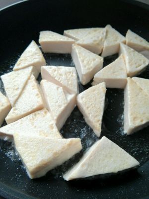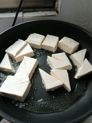 往不粘锅里放油,热油,将切好的豆腐放入不粘锅,加盐一起煎,稍微煎至有点金黄色即可,煎好一面,把另外一面豆腐翻过来,继续煎至金黄色。