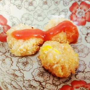 将玉米虾蓉团成一个一个小球球,表面均匀地裹上椰蓉