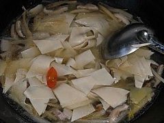 .再倒入沥干水的百页,加少量盐(咸肉己有咸味)鸡精、胡椒粉盛入碗中,洒上大蒜叶,味道鲜美,好吃是好吃得来,一顿光,想剩点做夜饭菜都没有也!