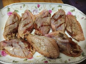 洗净鸡翅,两面用刀划开几道,酱油蚝油料酒倒在碗里,腌鸡翅,为避免太咸,平摆在盘子里腌制,撒上少许孜然粉和黑胡椒粉,腌制约二十分钟。