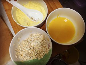 三个小碗分别装鸡蛋蛋液,玉米粉,燕麦