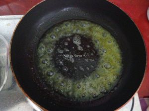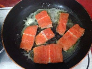 然后放入三文鱼骨,中火慢煎,煎至肉质变熟,肉色变金黄。