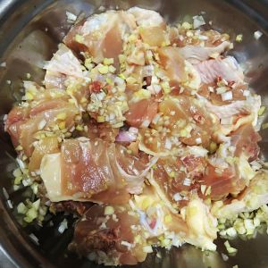 鸡腿剁成小块,把葱姜蒜拌入,调制均匀。
