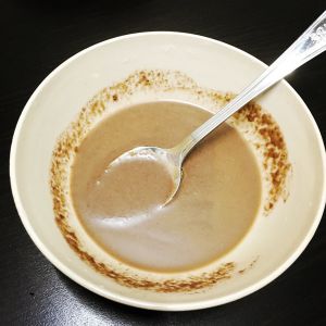 虾酱,料酒,白糖倒入碗中,调成腌制的酱汁。虾酱本身味咸,如果口味重可以加少许盐。