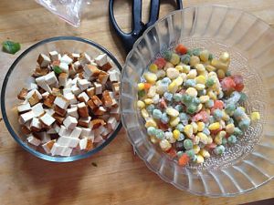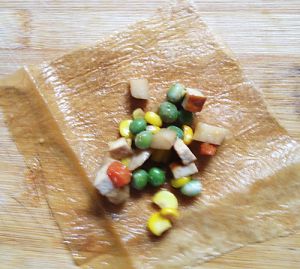 竹笋、豆腐干切丁,杂菜丁是买现成的。您家里有胡萝卜、青豆、玉米粒单独弄成杂菜丁也行,热锅适量橄榄油把菜丁翻炒,倒适量料酒,盐,鸡精炒熟备用。