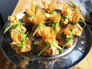 芹菜去叶焯水捞出,把包住菜丁的豆皮捆绑成烧卖的样子上蒸锅蒸10分钟